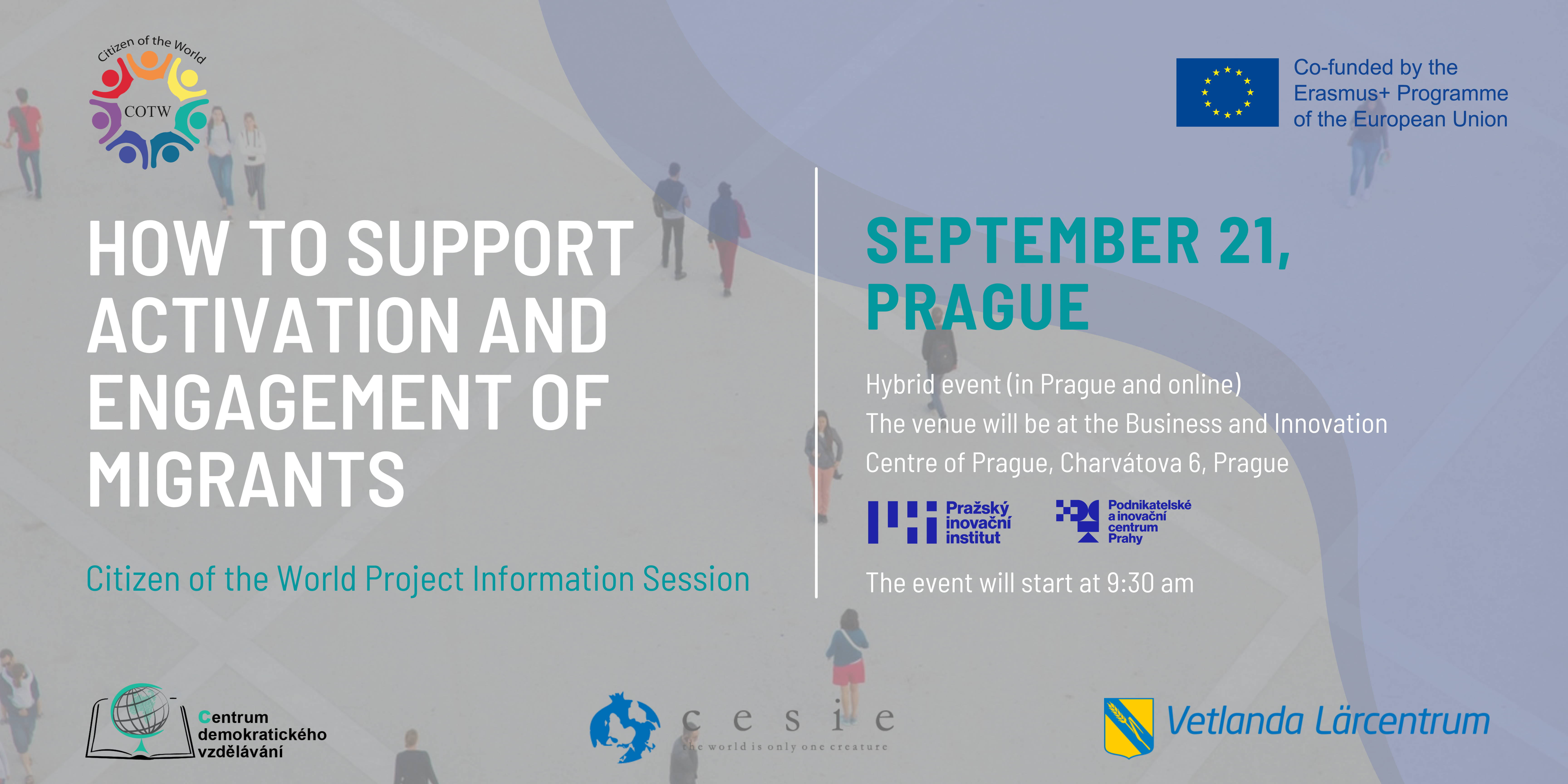 The Czech partner organisation in cooperation with the COTW project team invites you to a final information session which will take place on Wednesday the 21st of September from 9:30 am in Prague in the Business and Innovation Centre of Prague. The session will be part of our final transnational project meeting in Prague, and we will discuss adult educational and digital tools developed by the COTW project team from Sweden, the Czech Republic and Italy.